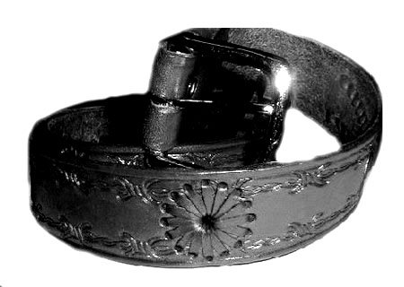 Handsome genuine top grain leather belt is tooled and braided with traditional western designs and the stunning silver tone buckle can be removed by unsnapping the two buttons at the end of the belt. Widh of the belt is 1 1/2".MADE IN MEXICO AND STAMPED